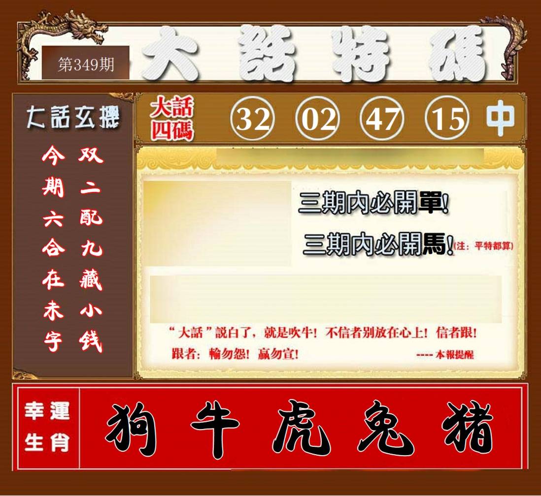 | 348期六肖 | 羊龙虎狗鸡牛 | 开:羊47 |
